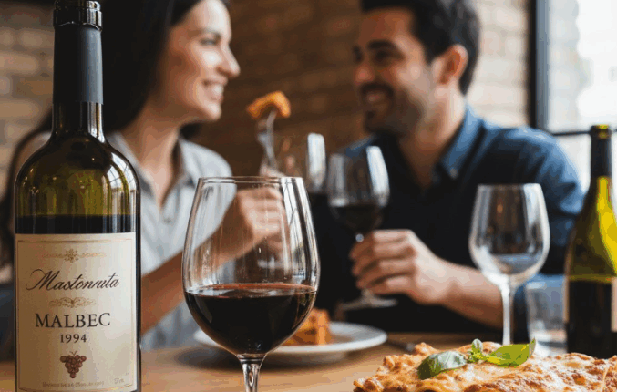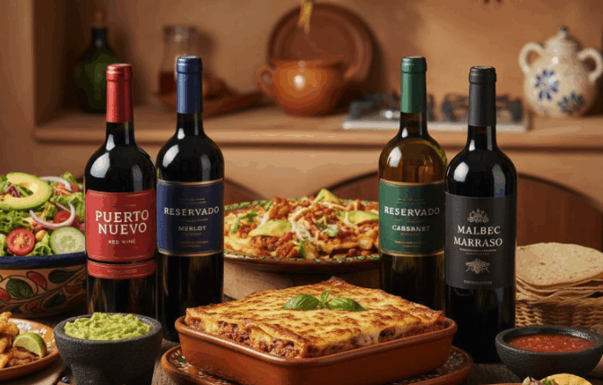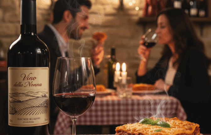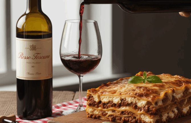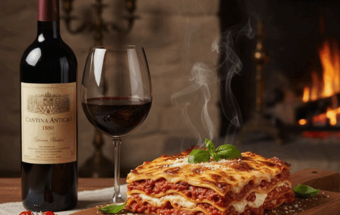 Los taninos estructurados del vino cortan la riqueza de la bechamel y la carne, limpiando el paladar.
